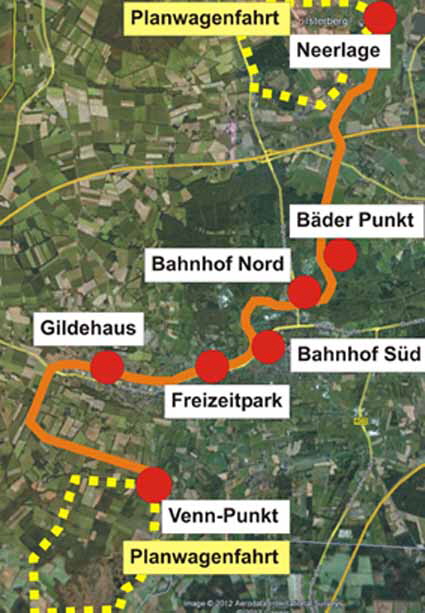 Haltestellen könnten sein - Bäderhaltepunkt - Bahnhof Nord - Bahnhof Süd - B 65 am Freizeitpark - Gildehaus Als ständige Bahnverbindungen kann ein Pendelverkehr zwischen diesen Stationen angeboten werden. Für den Haltepunkt an der alten B65 benötigt man lediglich einen Bahnsteig und eine Bedachung wie bei einer Bushaltestelle.Am alten Bahnhof Süd könnte man etwas großzügiger sein und einen kleinen Nachbau des alten Bahnhofs errichten, mit den Funktionen :- Info zu Fahrplan und Museum, Sonderfahrten- Bedachung - Platzwart Museum- Geräteraum- WC- Kiosk, eventuell auch mit ein paar Sitzplätzen |