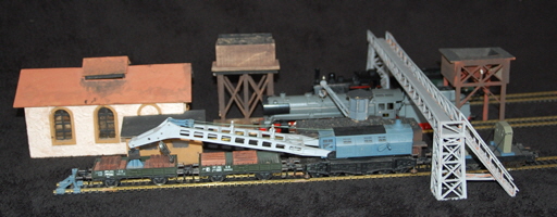 Brücke aus 2mm SperrholzSchuppen, Wassertank, Kohlebunker und Trichter sind aus Sperrholz und Pappe gefertigt |